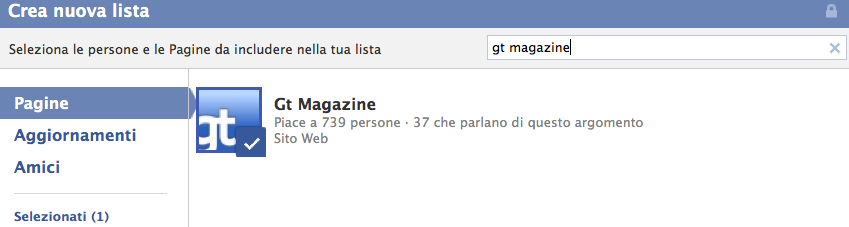 A questo punto ho scelto quali Pagine e profili inserire, servendomi della funzione di ricerca di Facebook.