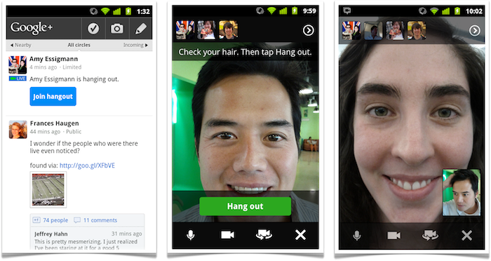A partire dai cosiddetti “Videoritrovi“, che sbarcano ora su smartphone. Google fa sapere che la funzione Videoritrovi attualmente supporta dispositivi Android 2.3 e superiori con foto/video camere (a breve sarà disponibile anche per iOS). La nuova applicazione di Google+ è già disponibile sull’Android Market.
