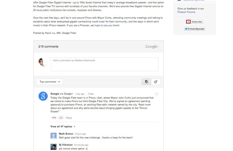 La novità è abbastanza chiara: l’utente che decide di commentare un post su Blogger, lo farà sfruttando Google+ e il suo account. Ma non solo, poiché l’integrazione è totale. E nel caso in cui su Google+ vi fosse una discussione pubblica sotto un post che fa riferimento all’articolo, anche all’interno del relativo blog i commenti saranno automaticamente aggiornati e visualizzati.
