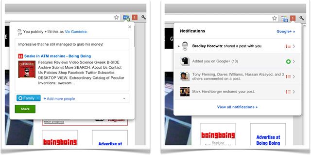 Tre le novità recenti di Google+ ci sono due estensioni riservate agli utenti di Chrome: una permette di condividere il +1 con i propri amici sul social network tramite la barra in alto, mentre il secondo fa sì che l’utente possa visualizzare le notifiche di Google+ tramite il browser.