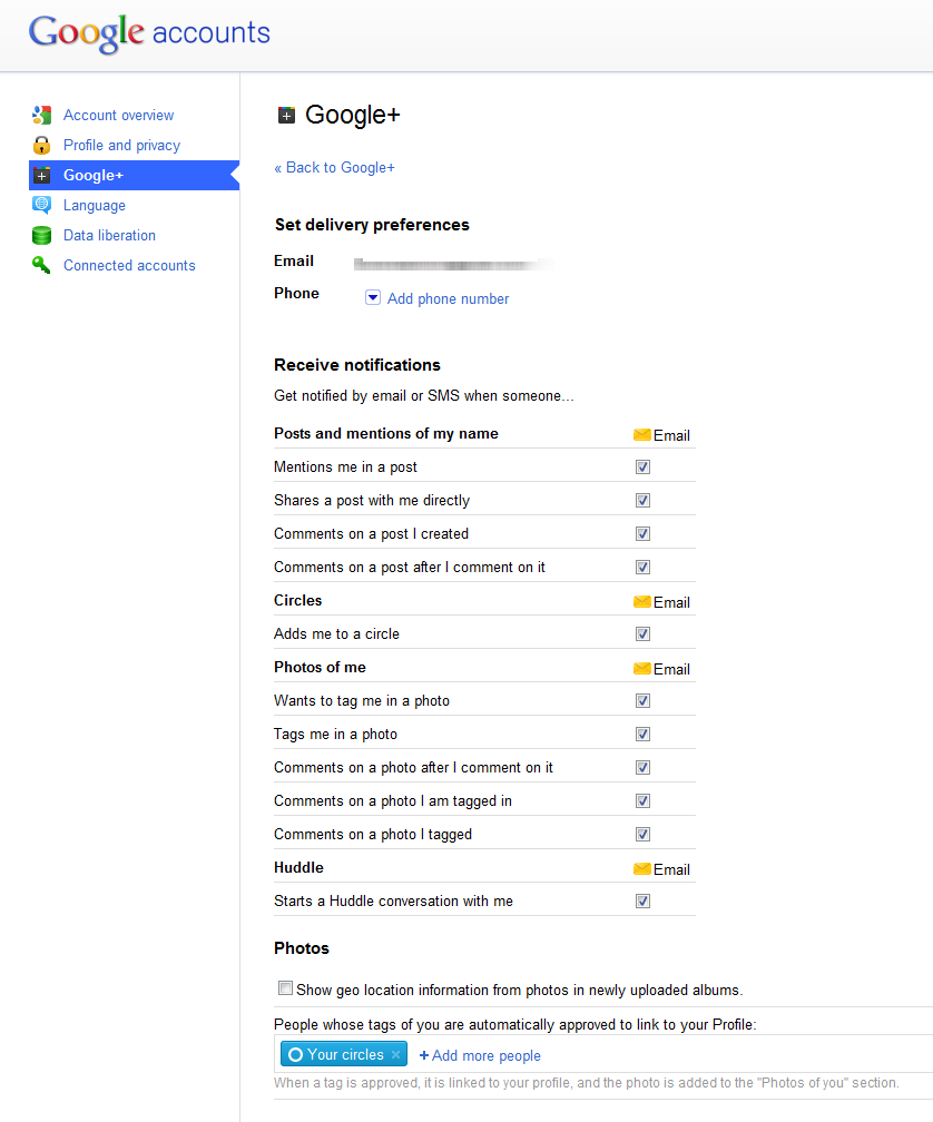 Alla voce “Google+” potete impostare quale tipologia di notifica ricevere, oltre alla possibilità di mostrare informazioni di geolocalizzazione sulle nuove foto caricate.