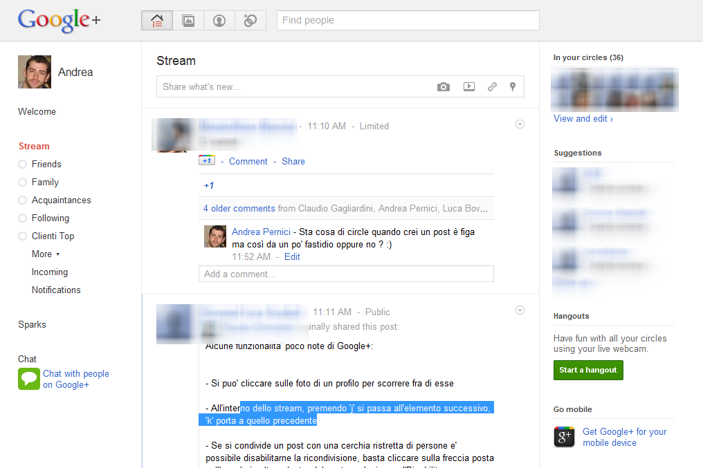 Grazie ad Andrea Pernici, ecco le prime immagini “dall’interno” riguardanti Google+, il social network di Google che sta inevitabilmente catturando tutte le attenzioni dell’universo sociale in rete in questi giorni. Vediamole insieme 🙂