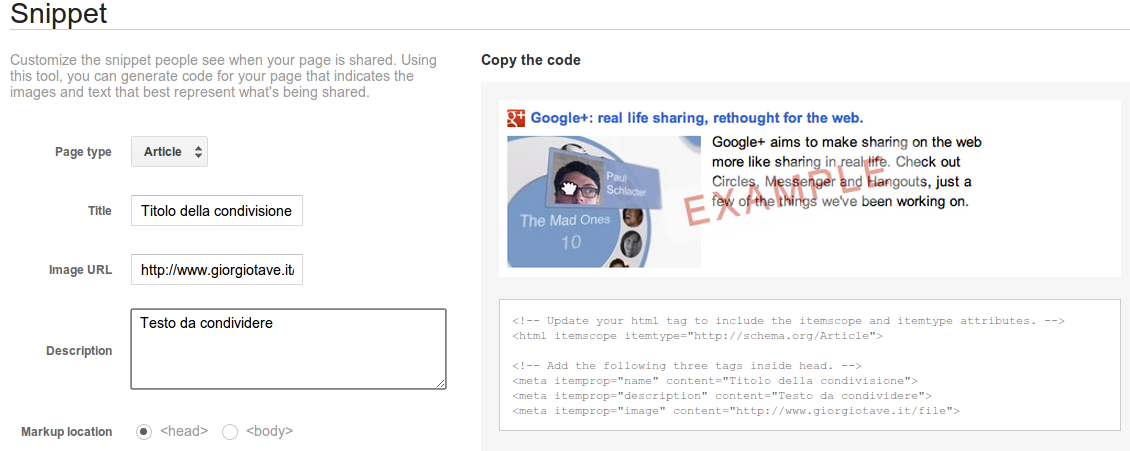 Per fare questo utilizziamo gli snippet di Google+, che ci permettono di scegliere gli elementi da condividere.